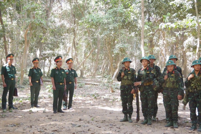 Đoàn công tác kiểm tra công tác phòng, chống say nắng – say nóng tại thao trường huấn luyện (Đại tá BSCKII TTƯT Đặng Ngọc Thuyết thứ 3 từ trái sang) |